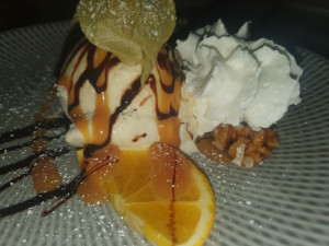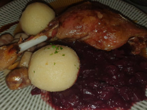 Nach kurzer Zeit wurde die Vorspeise serviert. Darauf folgend dann die Hauptspeise, welche wahlweise aus Keule, Brust oder al a Carte bestellbar war. Zum krönenden Abschluss gab es noch zum Nachtisch Vanilleeis mit Sahne.